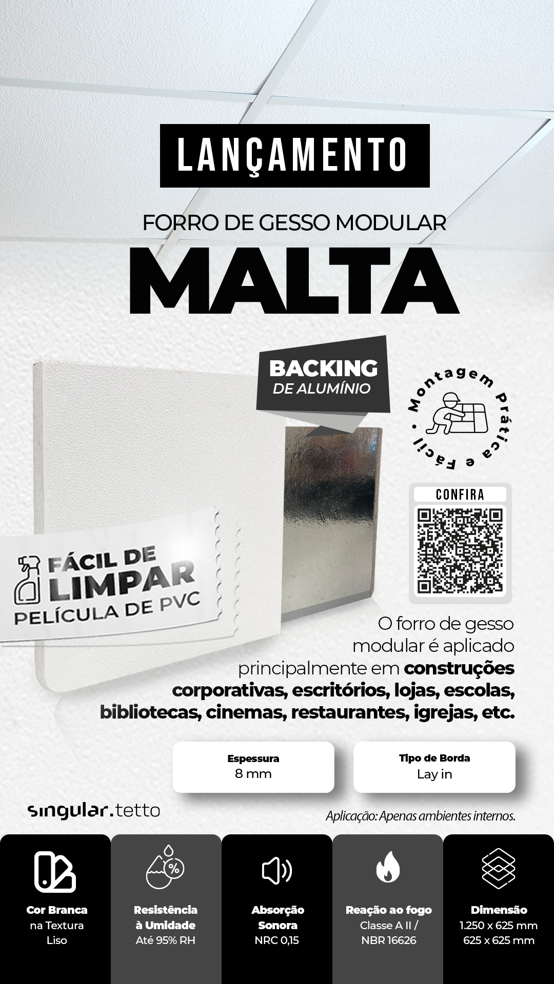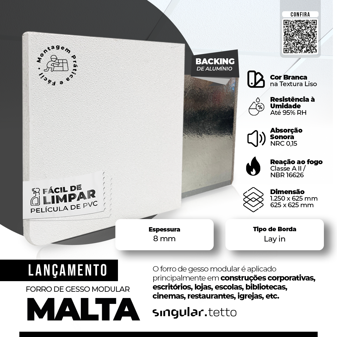 SINGULAR TETTO MALTA, é um forro de gesso removível, que possui uma película em vinil branco que, além de um ótimo acabamento, permite fazer a limpeza, em locais que requerem assepsia, higienização como hospitais, clínicas, cozinhas industriais, supermercados, edifícios comerciais, públicos, entre outras áreas.