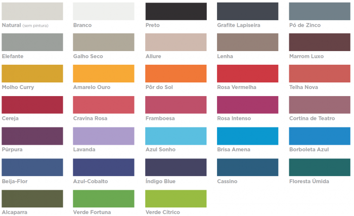 As cores desse catálogo são apenas uma referência e não representam o resultado das cores de pintura no produto. A tinta utilizada na pintura do produto foi desenvolvida especialmente para manter as características de retardância à chama, de absorção sonora e flexibilidade da placa, por isso o produto deve ser pintado em fábrica. Devido às características da tinta, das matérias-primas e das superfícies das placas, podem ocorrer ligeiras variações de tonalidade no lote de produção. A cor natural do produto é cinza claro, mas pode apresentar variação de cor. Cores especiais podem ser fornecidas sob consulta e em quantidade mínima.
